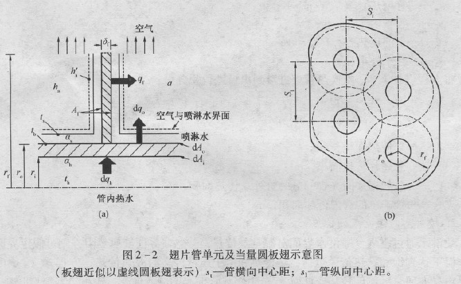 塔內(nèi)管束的管內(nèi)熱水溫度“ 和管外噴淋水溫ts以及管外空氣的焓分布情況如圖2 -1b所示。A.Hasan等人認(rèn)為;從圖2-1b可以假定,ts可取至實驗測得的噴淋水進(jìn)口溫度ta1,這是可以接受的。 對板翅管束上述假設(shè)同樣可用, 假定在翅表面和翅間光管段的噴淋水溫均為恒值,今取包含一個翅片在內(nèi)的傳熱管單元體來分析( 圖2—2a) ,研究管內(nèi)熱水對空氣和對噴淋水膜間的熱傳遞。
