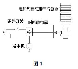 如圖4所示:a、打開整車鑰匙開關(guān),不銹鋼冷凝器正負很導通,但時間繼電器回路不通,故電控不銹鋼冷凝器底部電磁閥不通電。b、打開整車鑰匙開關(guān),不銹鋼冷凝器正負很導通,同時啟動發(fā)動機,發(fā)電機開始發(fā)電。同時發(fā)電機D端給時間繼電器一個電源,時間繼電器開始計時,10分鐘后,時間繼電器閉合發(fā)出信號并持續(xù)1秒,控制不銹鋼冷凝器排出油污及水分。