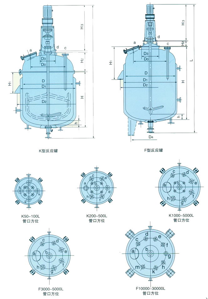 由于用戶因生產(chǎn)工藝、操作條件不盡相同,夾套加熱型式分為電熱棒加熱、蒸汽加熱、導(dǎo)熱油循環(huán)加熱,軸封裝置分為填料密封和機械密封,攪拌型式有錨式、漿式、鍋輪式、推進式或框式。開孔數(shù)量、規(guī)格或其它要求可根據(jù)用戶要求設(shè)計、制作。